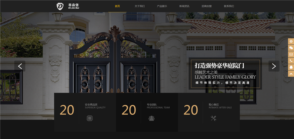公司以不断自主创新,多次塑造了门业、护栏、潮流的前沿风景,尤其满足高贵心境人群之需要,倾尽心力。在选材独特考究,制作精益求精,服务高雅与尊照等方面。都全面呈现出企业定位。产品定义的一致性和融合性。赢得业绩和广大消费群体的认可。由此产品遍及国内外重点城市和高端楼盘。尤其出口欧美与中东的繁盛地域而著称。由“蒂森堡”庭院门系列更是立足行业尖端,开创了庭院门高端产品的新时代,伴随生活尊贵指数的上升,必将迎来一个蒂森堡铝艺的春天。